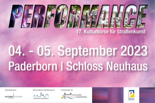 Die Performance Paderborn ist seit 2006 die führende Messe für Straßenkunst in Europa mit 140 live Shows in voller Länge an zwei Tagen – alles Open Air und Eintritt frei! Das Veranstaltungsgelände ist der Barockgarten in Schloss Neuhaus mit 25 verschiedenen Auftrittsflächen und Bühnen auf 50.000 qm. Das Fachpublikum und die Öffentlichkeit sind eingeladen täglich 70 Neuproduktionen aus den Bereichen Artistik, Straßentheater oder Walk-Act zu sehen. In der Schlosshalle sind das Messebüro, der Catering-Bereich und die Workshop-Räume. Dort finden u.a. auch die Performance Specials wie das Meeting of Festivals, Speed Dates zwischen Veranstalter:innen und Künstler:innen und die Vorstellung von neuen Projekten statt. Den Abschluss bildet am Dienstagabend eine 2-stündige Open Air Galashow.
